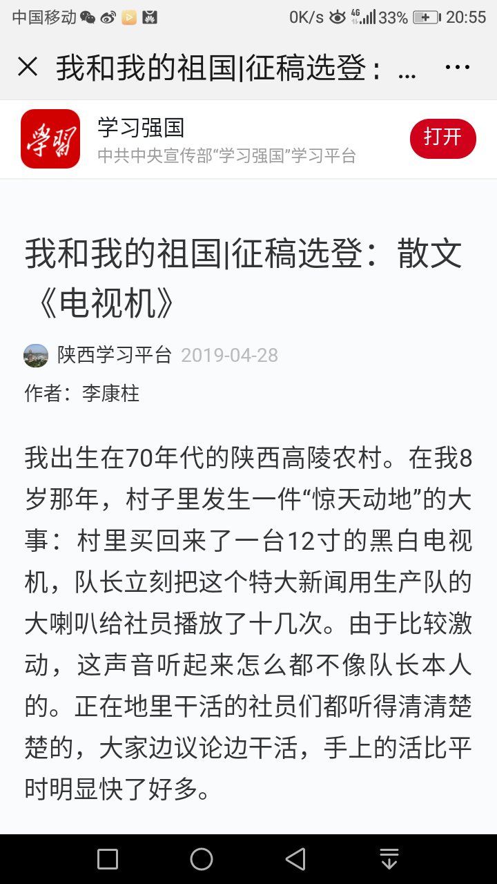 4月28日,當(dāng)大家正在瀏覽學(xué)習(xí)強(qiáng)國中,突然發(fā)現(xiàn)一篇我和我的祖國征文---《電視機(jī)》被刊載,作者的是陜鋼龍鋼公司規(guī)劃發(fā)展部職工李康柱。李康柱的文章被學(xué)習(xí)強(qiáng)國刊載在龍鋼公司黨員職工中引起熱議。大家紛紛向李康柱打來電話表示祝賀,你的文章學(xué)習(xí)強(qiáng)國刊載了!